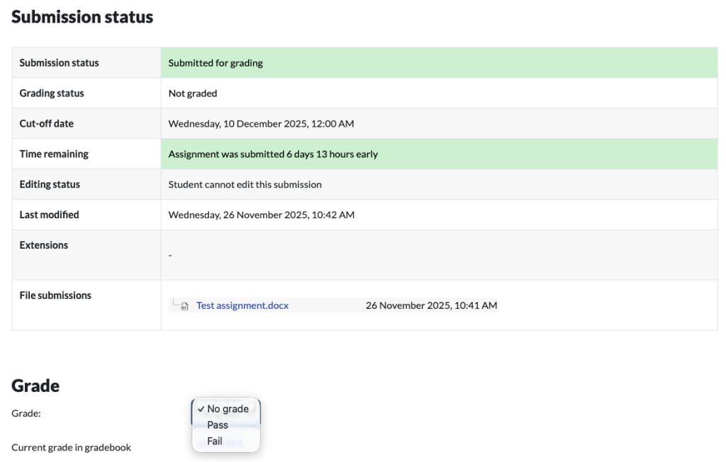 This will open the grading screen for this individual submission. From here, you can download the submission files in order to annotate them, set as ‘Pass’ or ‘Fail’, and leave text feedback directly in Moodle.